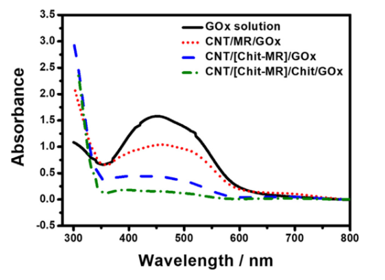 Fig. 4 通過UV-Vis光譜法測量的純GOx;CNT/MR/GOx;CNT/[殼聚糖-MR]/GOx和CNT/[殼聚糖-MR]/殼聚糖/GOx結構的吸收峰。所有催化的GOx濃度為5 mg mL