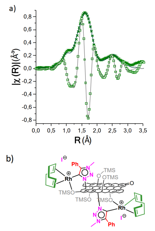 Figure 3. a)對于TRGO-3-Rh,EXAFS信號的最佳擬合(線)和實驗(點)FTs曲線(星號為模數(shù),正方形為實部)。b)根據(jù)EXAFS分析的TRGO-3-Rh結(jié)構(gòu)。