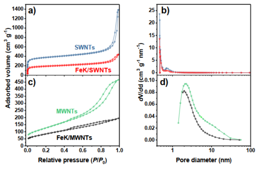 Figure 1. (a, b) SWNTs 和 FeK/SWNTs,(c, d) MWNTs和 FeK/MWNTs催化劑的N2物理吸附等溫曲線和孔徑尺寸分布。