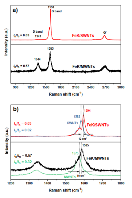Figure 4. (a)FeK/SWNTs 和 FeK/MWNTs催化劑的 Raman譜,