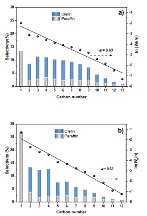 Figure 5. (a) FeK/SWNTs 和 (b) FeK/MWNTs催化劑在CO2加氫反應中的碳氫化合物產物分布。