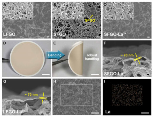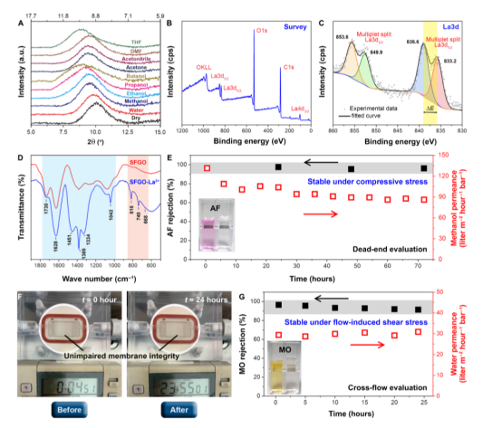 有機溶劑納濾膜(OSN)或耐溶劑納濾膜(SRNF)為制藥行業高效和具有成本競爭力的溶劑回收提供了前所未有的機會。在此,我們描述了用于高性能OSN應用的小片狀氧化石墨烯(SFGO)膜。我們的策略是通過控制橫向尺寸,為溶劑分子設計出更短和更少曲折的運輸途徑。通過使用La3+作為交聯劑和插層間隔劑,可以穩定SFGO膜的選擇層,并實現相關尺寸的超快選擇性分子輸運。甲醇的滲透率比大片GO (LFGO)高2.9倍,對三種有機染料具有高選擇性。更重要的是,SFGO-La3+膜在代表實際OSN運行條件的流體動力應力下,表現出了至少24小時的強大穩定性。這些理想的屬性來源于La3+交聯,它與SFGO的含氧官能團形成獨特的強配位鍵。其他陽離子則無效。