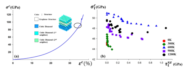 Figure 5. 對(duì)于多層石墨烯系統(tǒng),在軸向壓縮下,轉(zhuǎn)變應(yīng)力和應(yīng)變隨溫度的變化情況。石墨烯/金剛石相變的(a)轉(zhuǎn)變壓力和(b)轉(zhuǎn)變應(yīng)變。