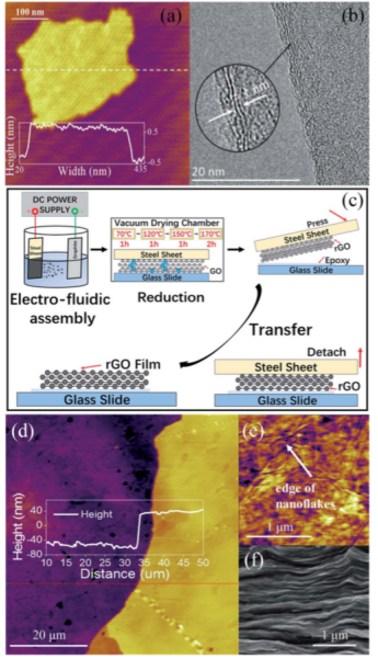 Fig. 1 GO納米薄片與rGO薄膜的表面表征及制備過程。(a) GO納米薄片的AFM圖。(b) GO納米薄片的HRTEM圖。(c) rGO薄膜的制備工藝。(d) rGO薄膜邊緣形態的AFM圖。(e) AFM檢測rGO膜的詳細表面結構。(f) rGO薄膜的SEM圖。