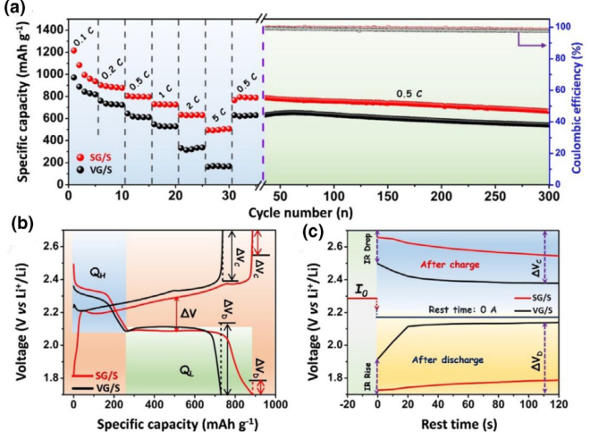 Figure 3. (a)倍率性能測試后,VG/S和SG/S正極在0.1 C至5 C的不同電流密度下放電和充電曲線,以及在0.5 C時(shí)的容量變化;(b)比較VG/S和SG/S正極在0.2 C時(shí)的恒電流充/放電曲線,以及(c)0.2 C下放電/充電后,VG/S和SG/S的相應(yīng)時(shí)間-電壓曲線(V-t)。