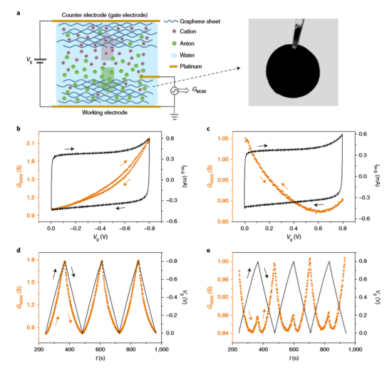 Fig. 2 單層rGO的常規背柵與多層rGO膜的電解質柵的比較。