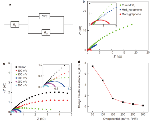 Figure 4. EIS測試:(a)用于模擬HER過程的等效電路;(b)EIS;(c)奈奎斯特圖;(d)R