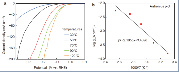 低成本、高效的氫氣析出反應(HER)催化劑對于提高基于清潔氫氣的能源經濟性非常重要。由于二維二硫化鉬(2D MoS2)具有出色的催化性能,因此對其進行了深入研究。然而,大多數報道的合成是費時、復雜的并且效率較低的。本工作證明了通過超快(60 s)微波引發的方法生產MoS2/石墨烯催化劑。石墨烯的高比表面積和電導率為MoS2納米片的生長提供了良好的導電網絡,同時具有快速的電荷轉移動力學。生成的MoS2/石墨烯納米復合材料在酸性介質中對HER具有優異的電催化活性,起始電位低至62 mV、陰極電流高、Tafel斜率為43.3 mV/decade。MoS2/石墨烯不僅具有出色的催化活性,而且在250 mV的超電勢下,仍顯示出長的循環穩定性,并具有約1000 mA cm-2的非常高的陰極電流密度。此外,MoS2/石墨烯催化劑在30至120°C的溫度范圍內表現出出色的HER活性,具有36.51 kJ mol-1的低活化能,為實際的可擴展處理提供了機會。