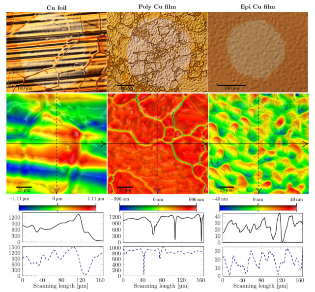 Figure 1. 石墨烯生長后銅箔(左欄),多晶銅膜(中欄)和外延銅膜(右欄)的銅表面形態比較。上圖:經過輕微氧化的光學顯微鏡圖像。中間:3D光學輪廓儀圖像。底部:沿中間3D輪廓中顯示箭頭的2D截面。