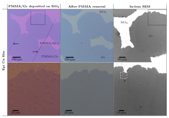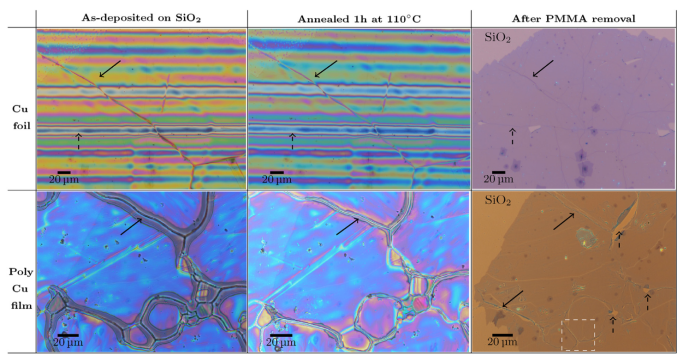 Figure 2. 比較在銅箔(上圖)和薄銅膜(下圖)上生長的轉移石墨烯。左列:室溫下干燥24小時后,在SiO