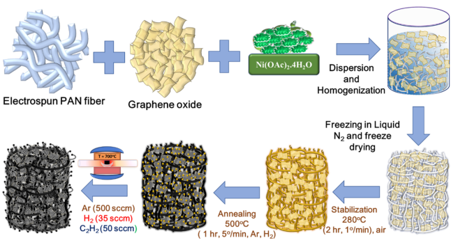 Figure 1. 分層CNTs@Gr-CNF氣凝膠的制造示意圖。
