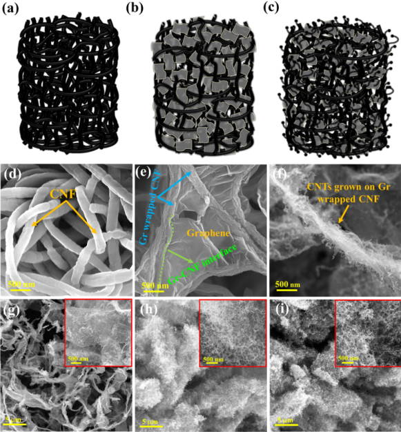 Figure 2. (a)CNF氣凝膠、(b)Gr-CNF氣凝膠和(c)碳納米管@Gr-CNF的示意圖;FE-SEM圖像:(d)CNF氣凝膠、(e)Gr-CNF氣凝膠、(f)碳納米管@GrCNF;(g,h和i)CNTs@Gr-CNF,其CNTs生長時間分別為1、5和10分鐘(插圖為高放大倍數圖像)。