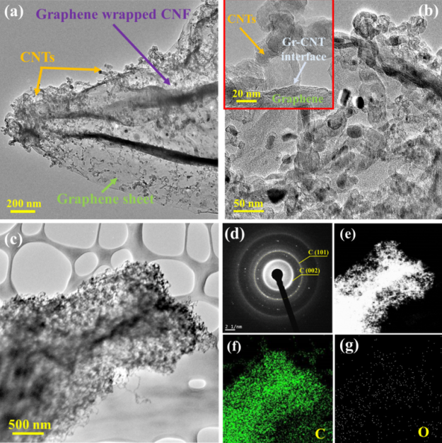 Figure 3. (a-b)CNTs@gr-CNF-1的TEM和HR-TEM圖像;(c-d)CNTs@Gr-CNF-5的TEM和SAED模式圖像;(e-g)CNTs@GrCNF-5的元素映射。