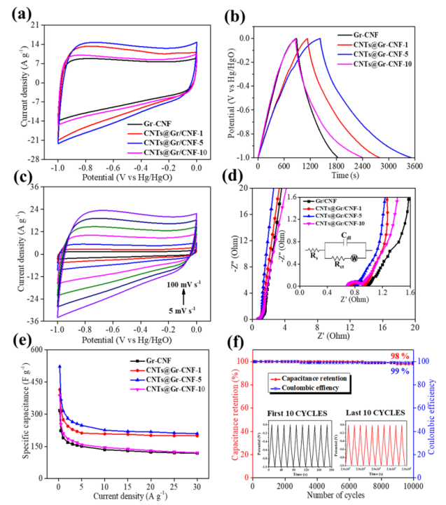 Figure 4. (a)CV曲線;(b)Gr-CNF、CNTs@Gr-CNF-1、CNTs@Gr-CNF-5、CNTs@Gr-CNF-10下測得的GCD曲線;(c)不同掃描速率下CNTs@Gr-CNF-5的CV曲線;(d)EIS曲線;(e)比電容Vs.電流密度;(f)NiCNTs@Gr-CNF-5的循環穩定性。