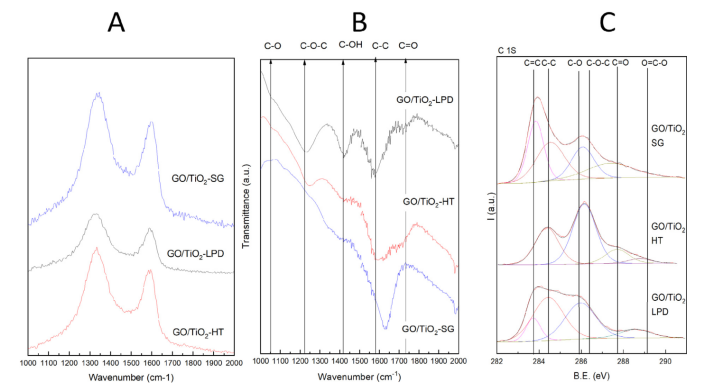 2復(fù)合材料的拉曼:D/G帶(A),F(xiàn)TIR(B)和XPS C 1s(C)。