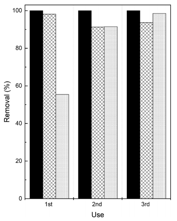 Figure 2. 反應(yīng)60分鐘后,每種催化劑在不同的重復(fù)使用量下均實(shí)現(xiàn)了TOC去除。(左)GO/TiO