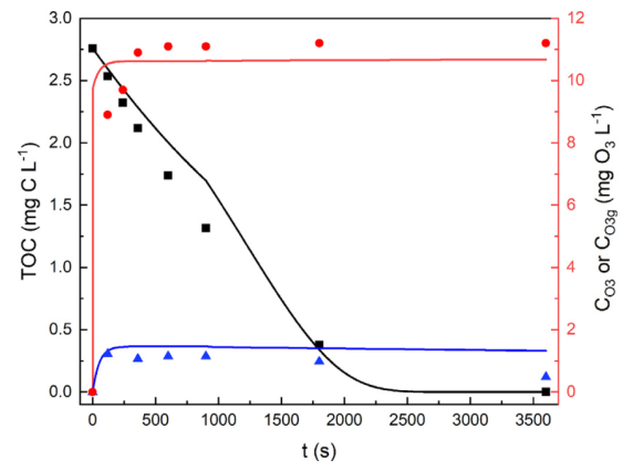 Figure 5. 在使用LPD催化劑的PhOz過(guò)程中,離開(kāi)反應(yīng)器并溶解在水中的氣體中實(shí)驗(yàn)和計(jì)算(根據(jù)動(dòng)力學(xué)模型)的TOC和臭氧濃度隨時(shí)間的變化