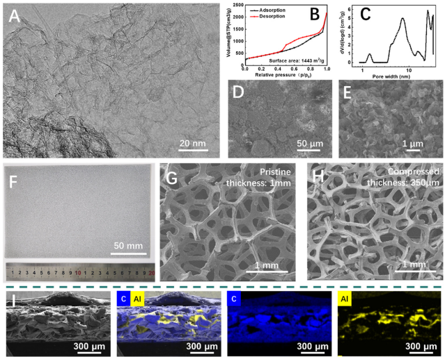 Figure 1. 石墨烯、泡沫鋁和石墨烯-鋁泡沫電極的表征。
