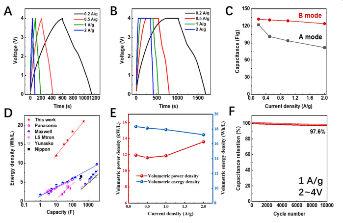 -2的電極。Al線的空間限制效應與通過COMSOL軟件模擬粘貼在2D Al箔上的相同厚石墨烯片相比,石墨烯上任何區(qū)域的石墨烯在任何區(qū)域均可提供足夠的液體有序擴散通道,從而顯著緩解了離子極化。具有4 V離子液體的100 F袋狀超級電容器在各種電流密度下均表現(xiàn)出低接觸電阻、高比電容,并且同時具有18 Wh L