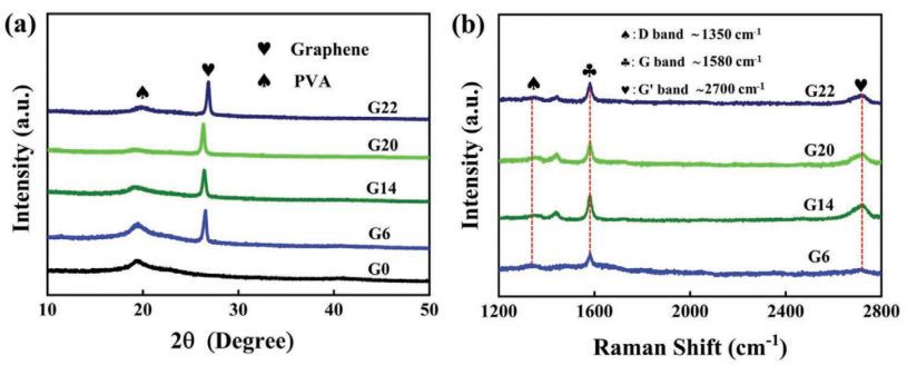 Figure 2. GR/PVA膜狀復(fù)合材料的a)XRD圖譜和b)拉曼光譜。
