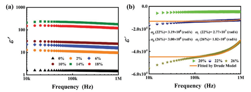 Figure 4. 不同質(zhì)量比石墨烯(0–26 wt%)的GR/PVA膜狀復(fù)合材料的介電常數(shù)譜。a,b)正介電常數(shù)譜和負介電常數(shù)譜。b)中的綠線為根據(jù)Drude模型擬合的結(jié)果。