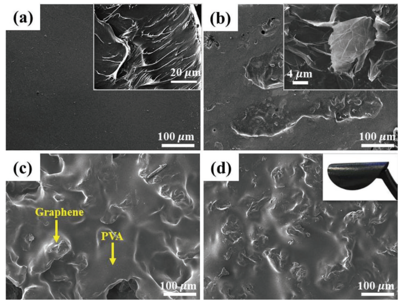Figure 5. GR/PVA膜狀復(fù)合材料的SEM圖像。a–d)分別具有6、14、20和22 wt%石墨烯的復(fù)合材料的SEM圖像。(a)插圖是膜狀復(fù)合材料的橫截面微觀結(jié)構(gòu)。(b)插圖是純石墨烯的SEM圖像。(d)插圖是膜狀超復(fù)合材料的照片。