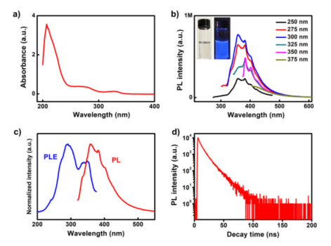 Figure 3. (a)紫外吸收光譜,(b) 250 ~ 375 nm的PL光譜,(c)分散在水中的t-GQDs的PL激發和發射光譜,(d)分散在水中的t-GQDs的PL衰減光譜。