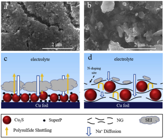 Figure 1. (a) Cu2S@SuperP和(b) Cu2S@NG電極的SEM圖。用于比較的(c) Cu2S@SuperP和(d) Cu2S@NG電極的形態和特征示意圖。