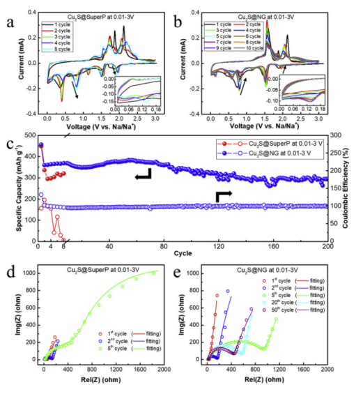 Figure 2. Cu2S@SuperP和Cu2S@NG電極在半電池中的電化學性能。循環伏安譜圖顯示(a) Na-Cu2S@SuperP電池和(b) Na-Cu2S@NG電池的CV圖。(d) Na-Cu2S@SuperP電池和(e) Na-Cu2S@NG電池的EIS圖。