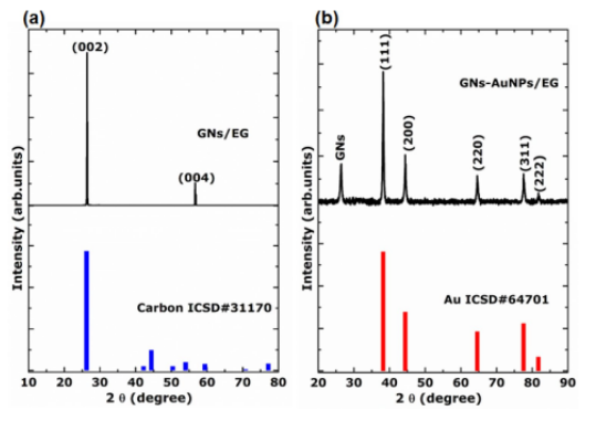 這里,報道了金納米顆粒(Au NPs)修飾石墨烯納米片(GNs)基納米流體的合成及導熱性質。其具體合成過程是通過納秒脈沖Nd:YAG激光(波長= 1,064 nm)燒蝕在乙二醇(EG)基礎液中的石墨靶,隨后金靶,以獲得GNs-AuNPs/EG雜化納米流體。通過一系列表征發現,結晶的Au NPs修飾片狀的GNs,其平均粒徑為6.3 nm。在25–45°C溫度范圍內的熱導率分析表明, GNs-AuNPs/EG雜化納米流體的導熱系數為0.41 W/mK,高于GNs/EG(0.35 W/mK),Au NPs/EG(0.39 W/mK)納米流體,以及EG基礎液(0.33 W/mK)。其導熱性能的提高可歸因于Au NPs和石墨烯片之間的協同效應。所合成的GNs-AgNPs/EG雜化納米流體有望應用于熱量轉移技術領域。此外,這項工作還提出了一種制備石墨烯-金屬納米復合材料的綠色合成方法。