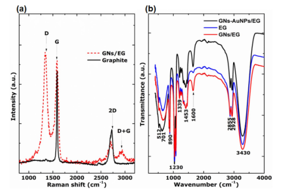 Figure 4. (a)拉曼光譜。(b)GNs-AuNPs/EG和GNs/EG納米流體以及EG基礎液的FTIR光譜。