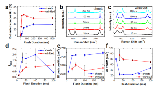 Figure 4. 閃蒸時間對石墨烯形貌的影響。(a)組分百分數與閃蒸時間的函數關系,(b-c)Raman光譜,Raman分析:(d)2D/G強度比例,(e)2D峰位置,(f)2D FWHM。