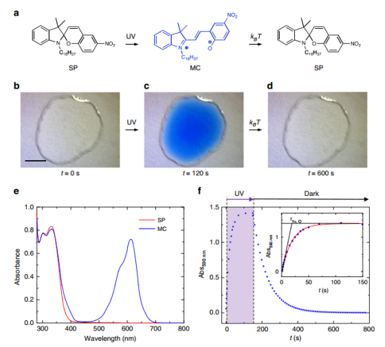 Figure 1. 光開關動力學的光學表征。(a)S)衍生物和MC異構體的可逆的光化學和熱交換,(b-d)初始狀態以及光異構化前后的光學照片,(e)SP/MC溶液的吸收光譜,(f)動力學檢測。