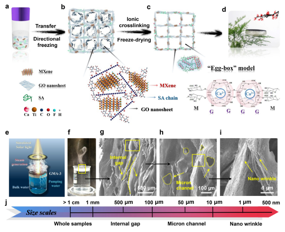 Figure 1. 基于3D宏觀氧化石墨烯/MXene氣凝膠(GMA)的太陽能界面蒸發器。