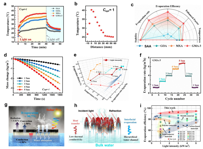 Figure 3. (a)在1 sun下,表面溫度隨時間變化。(b)GMA-3的溫度分布,在1 sun下側面的距離,GMA-3表面定義為0毫米。(c)比較太陽能驅動的界面蒸發性能;在不同光強度下,GMA-3(d)水的質量變化和(e)穩定蒸發效率、蒸發速率和表面溫度。(f)GMA-3循環太陽能驅動的界面蒸發性能。(g)GMA-3在太陽驅動的界面蒸發過程中的能量平衡和傳熱圖。(h)GMA-3系統中的光和熱管理以及水傳輸的插圖。(i)GMA-3太陽驅動的界面蒸發性能與在不同太陽光照強度下與先前工作的比較。