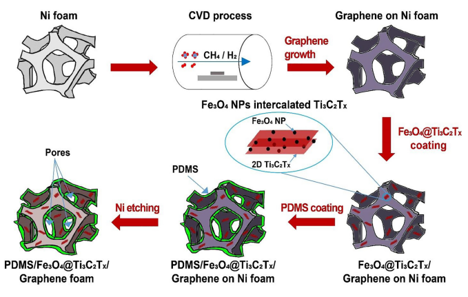 隨著電子和電信的快速增長,迫切需要開發電磁干擾(EMI)屏蔽技術,以防止電子設備發生故障以及電磁(EM)波對人體健康的威脅。本文中,我們展示了一種多功能的EMI屏蔽皮膚,它不僅具有出色的EMI屏蔽效果(SE),而且還可以充當壓力傳感器。EMI屏蔽皮膚由獨立式泡沫、結構的石墨烯、增強的聚二甲基硅氧烷(PDMS)基質組成。石墨烯泡沫(GF)由嵌入Ti