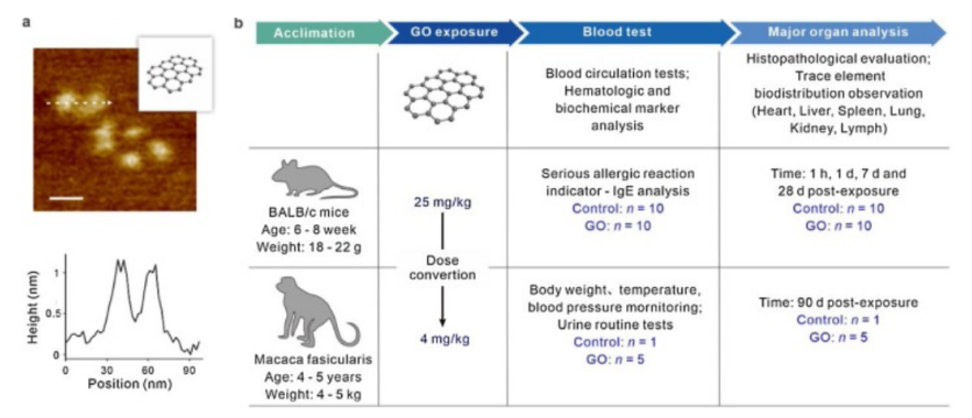 在大規模工業生產和臨床轉化潛力的背景下,對氧化石墨烯(GO)的毒理學評估一直在積極進行。盡管如此,GO的安全性仍存在很大爭議,特別是由于在高等哺乳動物中缺乏毒理學特征。在這里,我們表明,血液暴露低于最大安全起始劑量,接觸到GO可能導致哺乳動物意外死亡,包括非人類靈長類動物(1 / 5的獼猴和7 / 121只小鼠),而在其他動物中仍然可以普遍接受。在死亡動物中發現了較高的免疫球蛋白E水平和嚴重的肺損傷,表明GO誘發了急性過敏反應。值得注意的是,我們沒有觀察到其他兩種碳納米材料(包括單壁碳納米管和納米金剛石)的過敏反應和死亡。這種差異可能是由于二維GO材料在體內的循環時間較長所致。因此,這項研究凸顯了評估石墨烯和其他納米材料超敏風險的緊迫性。