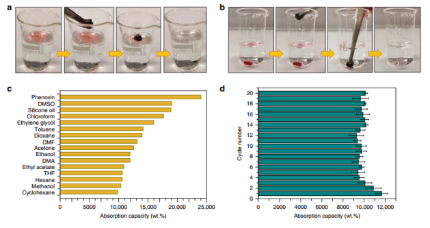 Figure 3. COF/rGO氣凝膠的吸附性能。從水中吸附染色的硅油a)和氯仿b)。c)吸附效率和d)循環(huán)穩(wěn)定性。基于三個獨立測量,誤差線顯示了標準偏差。二甲基亞砜,二甲基甲酰胺,二甲基乙酰胺和四氫呋喃分別縮寫為DMSO,DMF,DMA和THF。