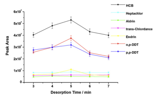 Figure 4. 七種OCP的解吸時間曲線。萃取時間25分鐘,其他萃取條件與Fig.3相同。