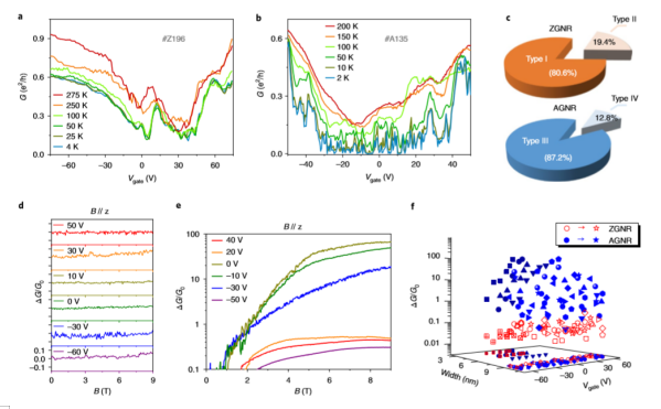 Fig. 4 h-BN中相對較寬的GNrs中的場效應和磁電特性。