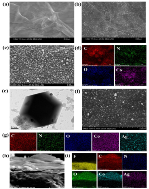 Figure 2. (a)GO膜、(b)Ag+/GO膜和(c)ZG-5-2膜表面的SEM圖,和(d)C、N、O和Co元素分布,(e-g)Ag+/ZG-5-2膜的TEM圖,SEM圖和元素分布,(h)Ag+/ZG-5-2膜的SEM圖和(i)元素分布。