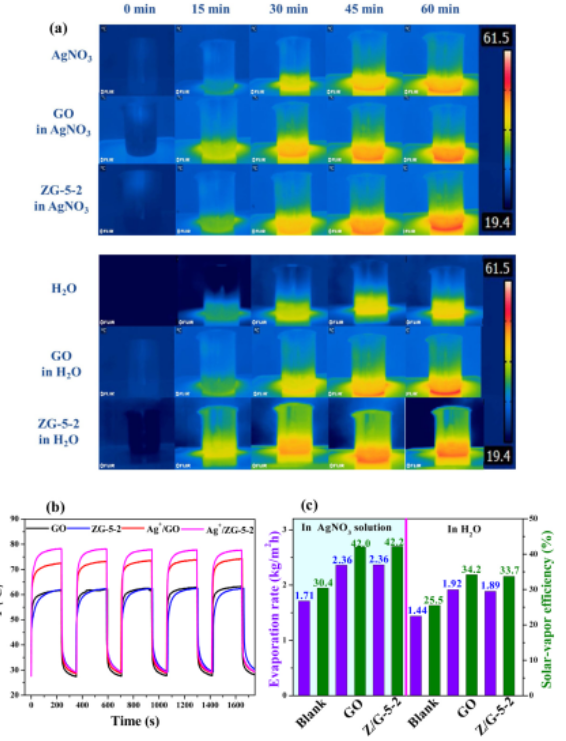 Figure 5. (a)不同時間太陽光照射下,在硝酸銀溶液和水溶液中GO和ZG-5-2膜的紅外熱像圖,(b)不同樣品在開關五個周期期間的溫度演變曲線,(c)不同樣品分別在硝酸銀溶液和水溶液中的蒸發速率和太陽蒸汽效率。