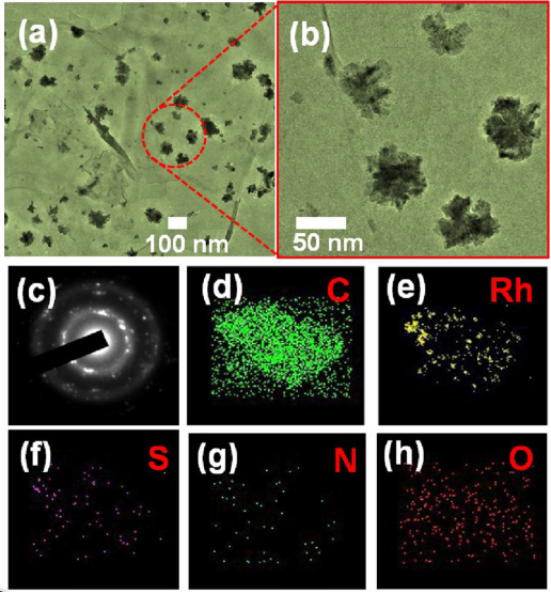 Figure 4.(a)Rh-GO的高分辨率透射電子顯微鏡(HRTEM)圖像。(b)Rh NS的HR-TEM圖像,粒徑約為50 nm。(c)復合材料的SAED圖,揭示了Rh NS的晶體性質(zhì)。圖(d)至(h)分別對應C,Rh,S,N和O分布的EDAX元素映射。