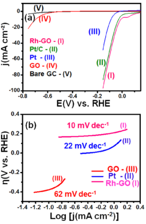 Figure 5. (a)Rh-GO,商用鉑絲,功能化GO和空白GC在0.5 M H2SO4中的HER極化曲線(LSV)。(b)不同催化劑材料的HER Tafel圖比較。