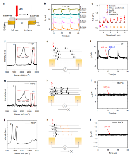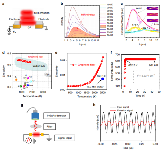 在自由空間光基通信平臺(tái)中,中紅外光(MIR)在生物醫(yī)學(xué)工程、環(huán)境監(jiān)測(cè)和遙感系統(tǒng)等領(lǐng)域有著重要的應(yīng)用。使用兩個(gè)相同的設(shè)備在網(wǎng)絡(luò)中集成MIR生成和接收,對(duì)于MIR通信的小型化和簡(jiǎn)化至關(guān)重要。然而,由于性能低下的固有局限性,常規(guī)的MIR發(fā)射器和接收器不是雙向的,通常需要低溫冷卻。在這里,我們證明了由弱耦合石墨烯層組裝的宏觀石墨烯纖維(GFs),由于光熱電效應(yīng)在毫米長(zhǎng)度上的持久性和快速調(diào)制灰體輻射的能力,允許在室溫下進(jìn)行MIR檢測(cè)和以兆赫調(diào)制頻率發(fā)射。基于GF的雙重功能,我們建立了一個(gè)通過(guò)在兩個(gè)相同GF之間切換模式進(jìn)行雙向數(shù)據(jù)傳輸?shù)南到y(tǒng)。我們系統(tǒng)的在室溫下操作和在工業(yè)織物規(guī)模上生產(chǎn)GFs的潛力,為簡(jiǎn)化和穿戴式光通信提供了機(jī)會(huì)。