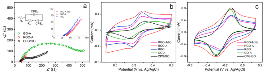Figure 2. (a)CPG/GO、RGO-A以及GO-A電極的EIS阻抗圖,電極在含5 mM 鐵氰化鉀的100 mM pH 7.0無氧PBS中測試。(a)中右側插入: 放大的RGO-A與RGO電極的阻抗圖的比較。(a)中左側插入:用于擬合阻抗數據的等效電路。(b)CPG/GO、GO-A、RGO、RGO-A以及RGO-A(N)電極在含有5 mM鐵氰化鉀的100 mM pH 7.0無氧PBS中,以50 mV/s掃描的CV曲線。(c)在含有[Ru(NH)