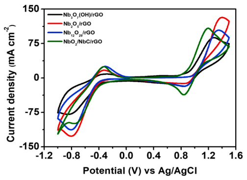 2/NbC/rGO電催化劑在循環伏安法中表現出最佳的電化學活性,具有最高的峰值電流密度和對VO