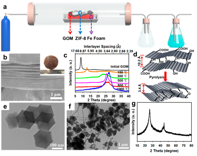 Figure 2. (a)Fe SAs/N-C的制造裝置圖。(b)GOM橫截面的SEM和獨立GOM的照片(插圖)。(c)從150到1000°C熱解的GOM的XRD光譜。(d)熱處理后GOM的層間距變化示意圖。(e)Fe SAs/N-C的TEM圖像。沒有GOM,熱解的ZIF-8的(f)TEM圖像和(g)XRD圖譜。