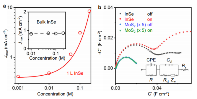 要實現高效的光電化學水分解,需要更好地了解光電極表面附近的離子動力學,例如擴散,吸附和反應。然而,對于宏觀的三維電極,通常很難將表面效應對總光電流的貢獻與整體中各種因素的貢獻區分開。在這里,我們報道了一種由InSe晶體單層制成的光陽極,它被單層石墨烯封裝以確保高穩定性。由于InSe具有高遷移率和強抑制電子-空穴對復合的特性,我們在眾多的光響應二維材料中選擇了InSe。利用原子薄電極,我們獲得了密度大于10 mA cm−2的1.23 V可逆氫電極的光電流,比其他二維光電流大幾個數量級。除了InSe的顯著特性外,我們還將其增強的光電流歸因于陽極表面附近的氫氧離子和光產生的空穴之間的強耦合。結果,由于存在離子束縛的空穴而抑制了電子-空穴的復合,因此即使在照明停止后也觀察到持續的電流。該結果為研究電極表面的離子動力學提供了一個原子薄材料平臺,并為開發新一代高效光電極提供了思路。