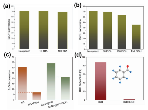 Figure 3. SACo@NG表面上氧化BzOH時,自由基清除劑對該反應的影響。a)叔丁醇用量,b)乙醇用量。 c)在NG和CoNP@NG上氧化BzOH時,全部EtOH劑量對該反應的影響。d)在SACo@NG上氧化BzH時, 全部EtOH劑量對該反應的影響。